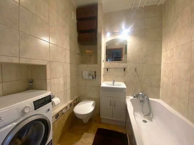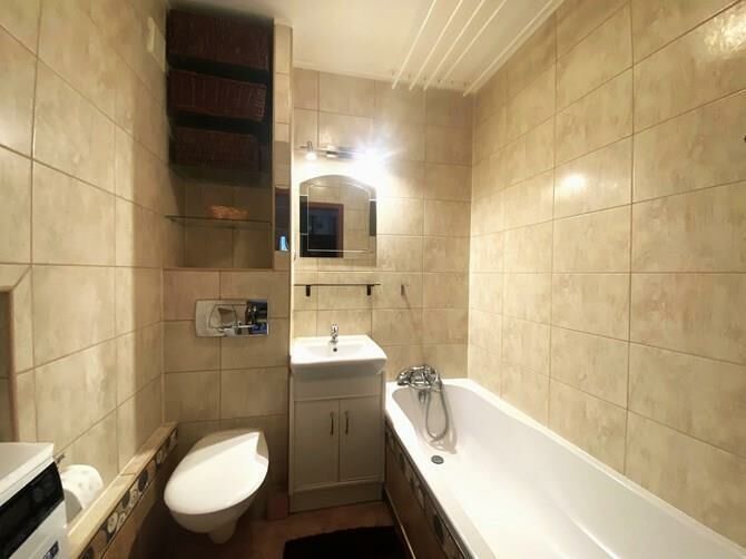 Łazienka: wanna, pralka, WC oraz umywalka.
