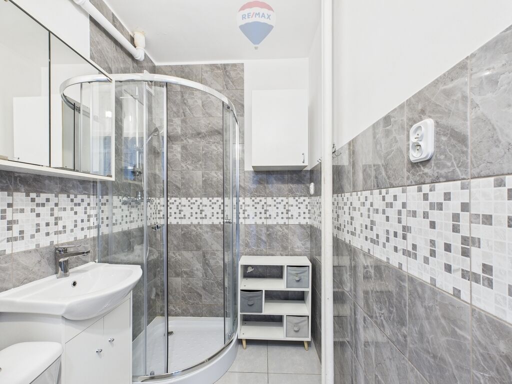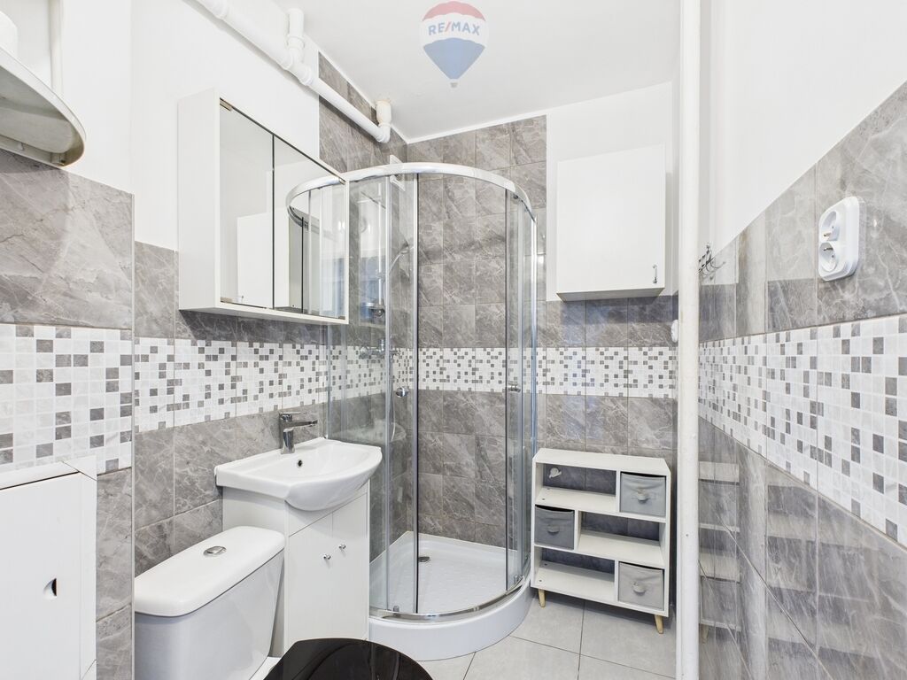 estetycznej łazienki z prysznicem oraz oddzielnej, jasnej kuchni.