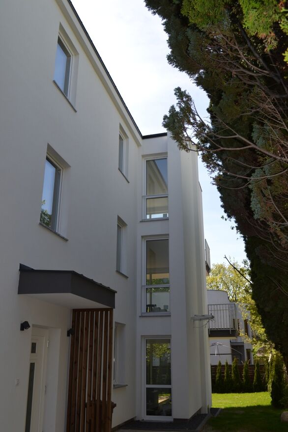 Budynek nawiązujący do modernizmu , o ponadczasowej prostej bryle z płaskim dachem i białą elewacją jest zrealizowany ze szczególnym naciskiem na funkcjonalność stref i układu pomieszczeń.