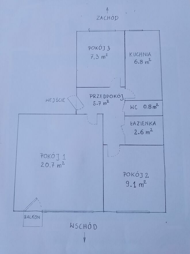 3 pokoi (20.7m2, 9.1m2, 7.3m2),