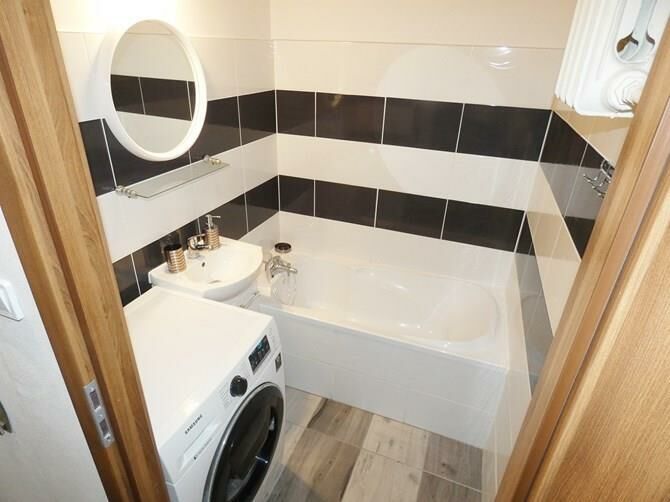 Łazienka: wanna, pralka, szafka z umywalką, lustro.