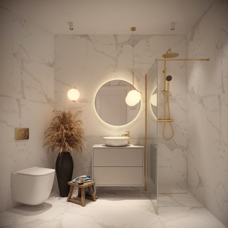 Wyposażenie premium: AGD (Liebherr, Bosch, Teka), deska KAHRS, włoski gres, podświetlane lustro LED
