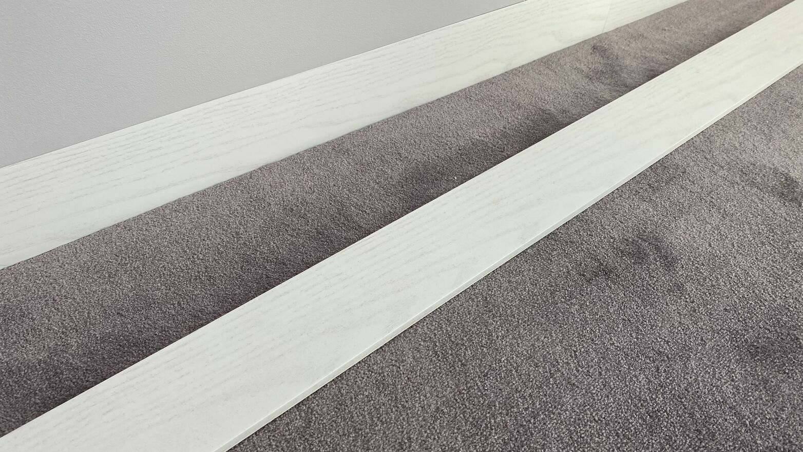 Listwy Nowe Wścienne podłogowe / Deski fornirowane dwustronnie jesion biały. Klasa premium!W wyniku niewspółpracowania montera podłogi i osobno stolarza, montera listew dościennych, zostałem obciążony kwotą 3,5tys. zł (mam fakturę) za 58,06mb listwy obustronnie fornirowane o wys. 68mm. Deska jest polakierowana na kolor śnieżnobiały lakierem niepalcującym ultramat. Pięknie i prestiżowo wygląda po zamontowaniu w profil alu w ścianie np. Piu Design. Listwy są nowe, przygotowane na specjalne zamówienie, klasa Premium.