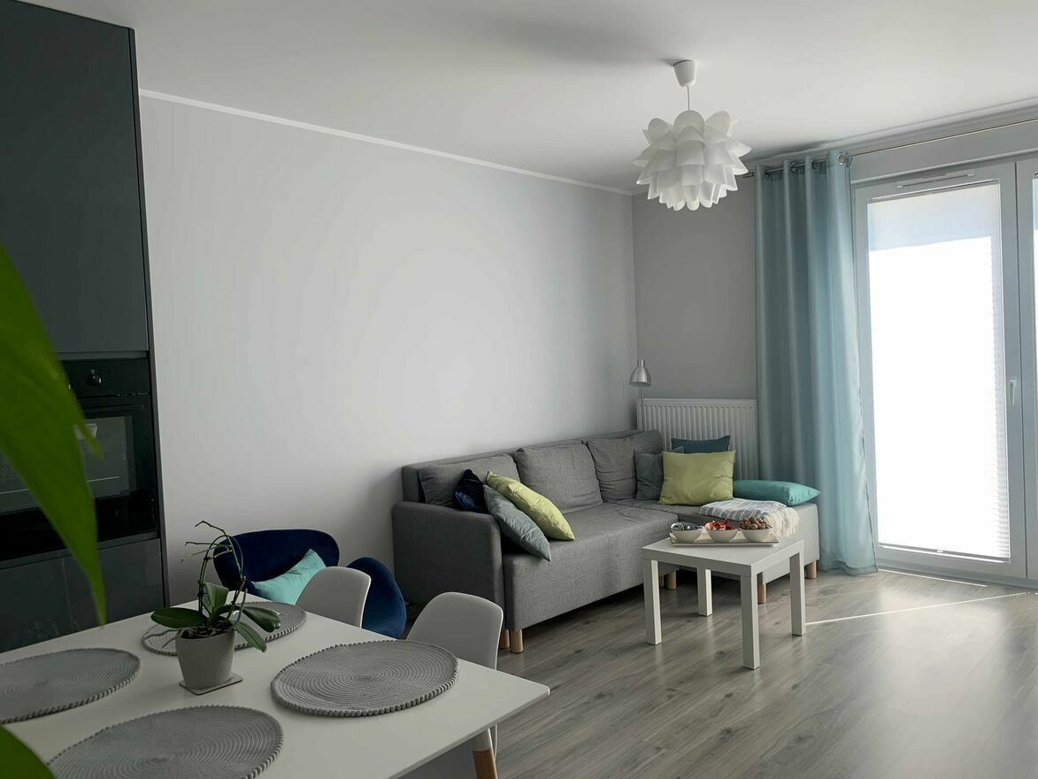Mam do wynajęcia 2 pokojowe mieszkanie o powierzchni 42,6 m2 w spokojnej, malowniczej dzielnicy Gdyni, Wiczlino - Ogród, w skład którego wchodzi:~ Salon z aneksem kuchennym, w tym (płyta indukcyjna, piekarnik elektryczny, zmywarka, lodówka) sofa narożna, stół z krzesłami, szafki RTV