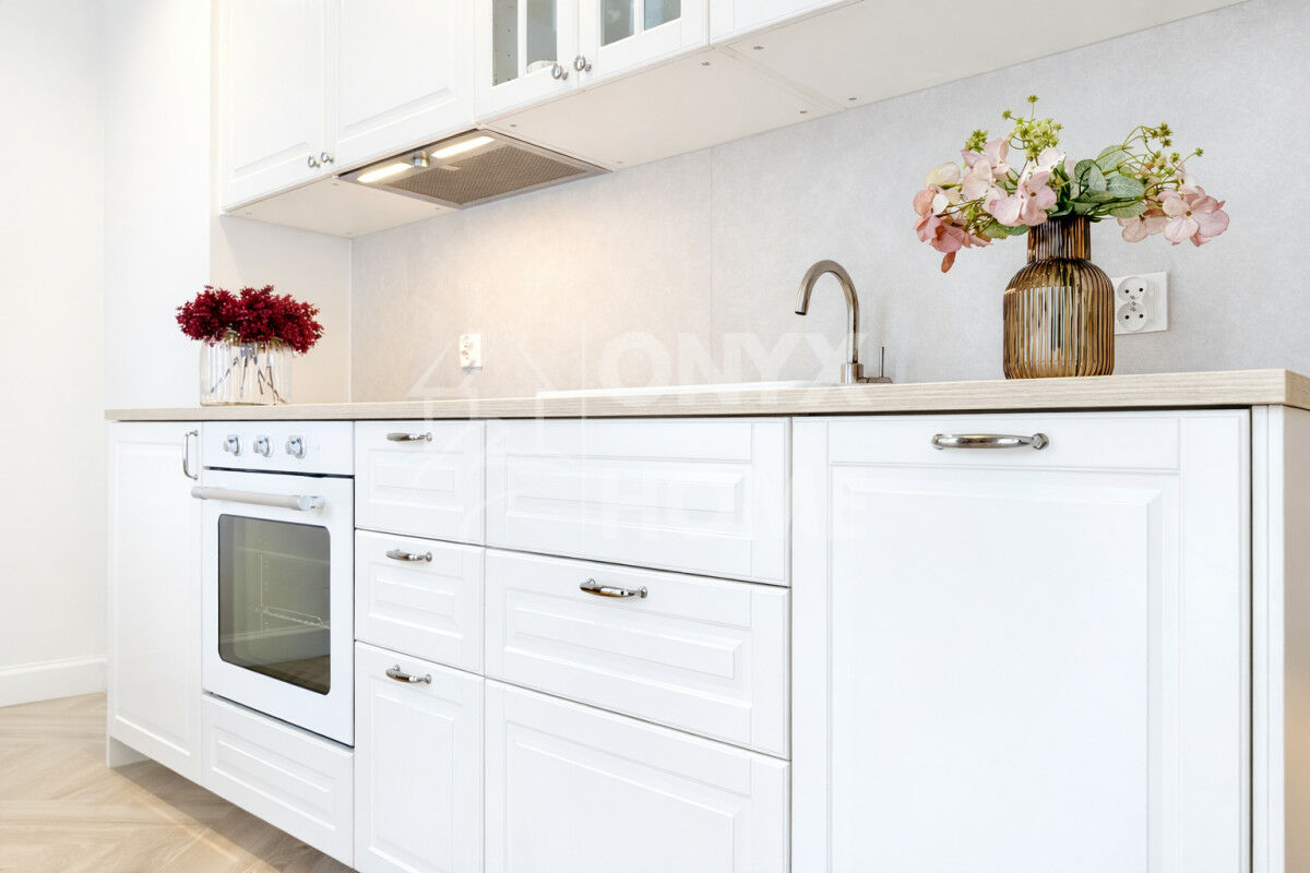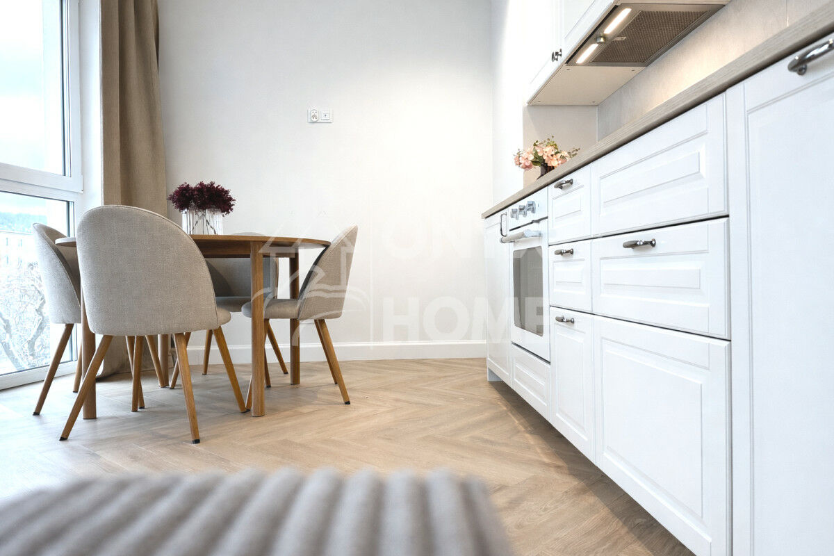 - kuchnia z oknem otwarta na salon wyposażona w lodówkę, zmywarkę, piekarnik, płytę indukcyjną, okap). Posiada pełen zestaw naczyń i akcesoriów kuchennych,