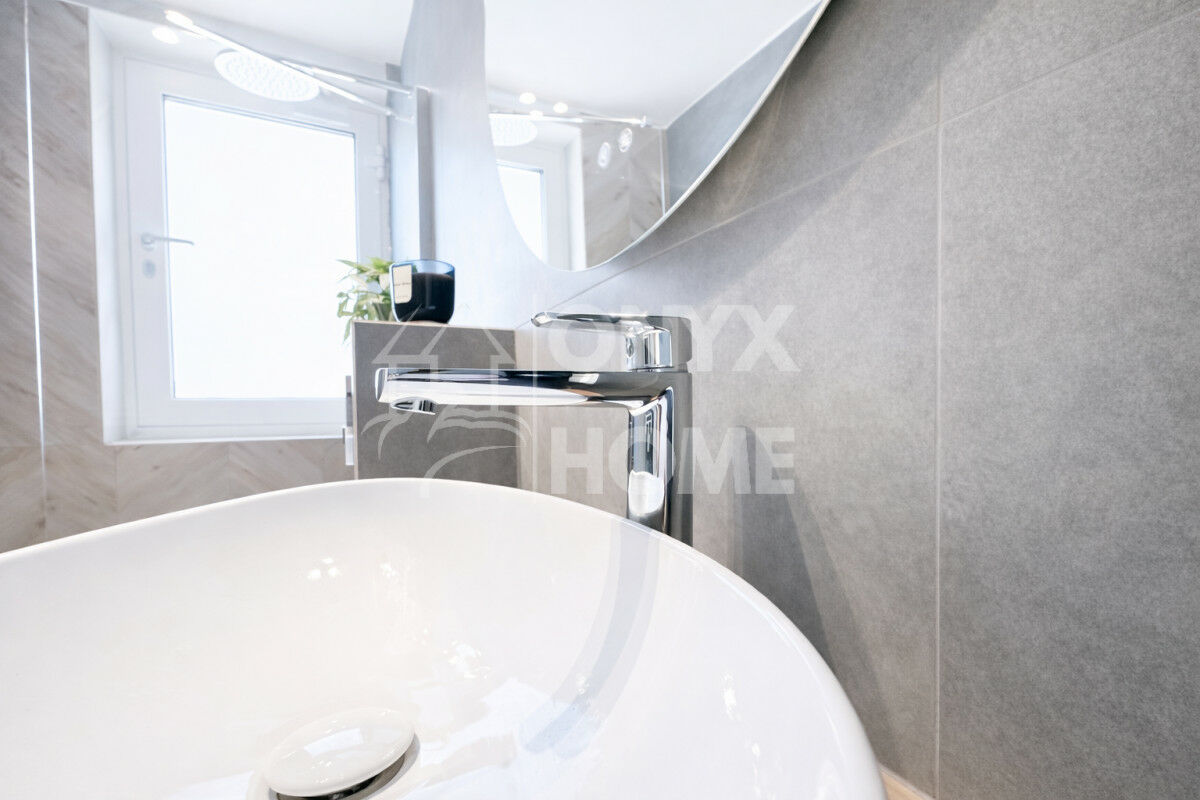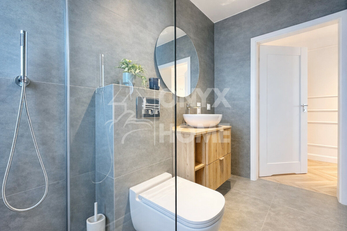 - oddzielna łazienka z oknem, kabiną walk-in, baterią podtynkową, szafką z umywalką, WC.