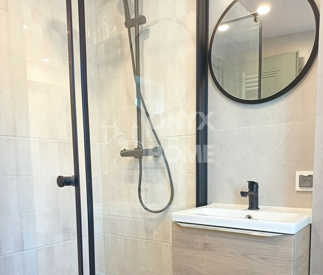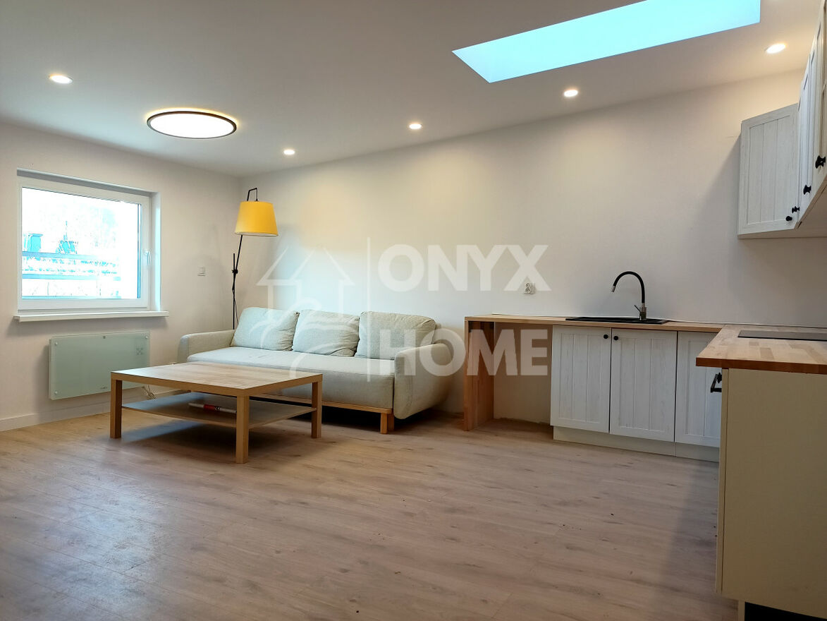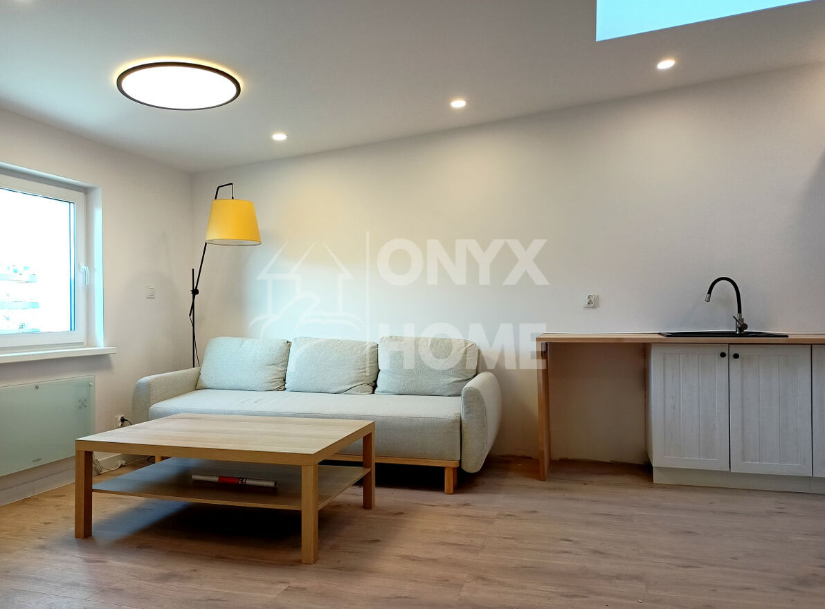 Salon połączony z aneksem kuchennym w kształcie litery L (konieczność wyposażenia w AGD), z sofą i stolikiem na wyposażeniu, łazienka z nową kabiną prysznicową, w sypialni nowe łóżko.