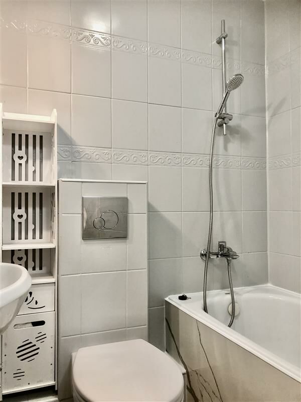 - w łazienka połączona z toaletą i posiada wannę,