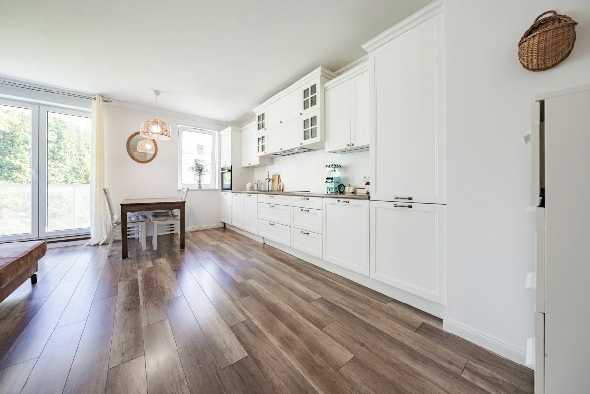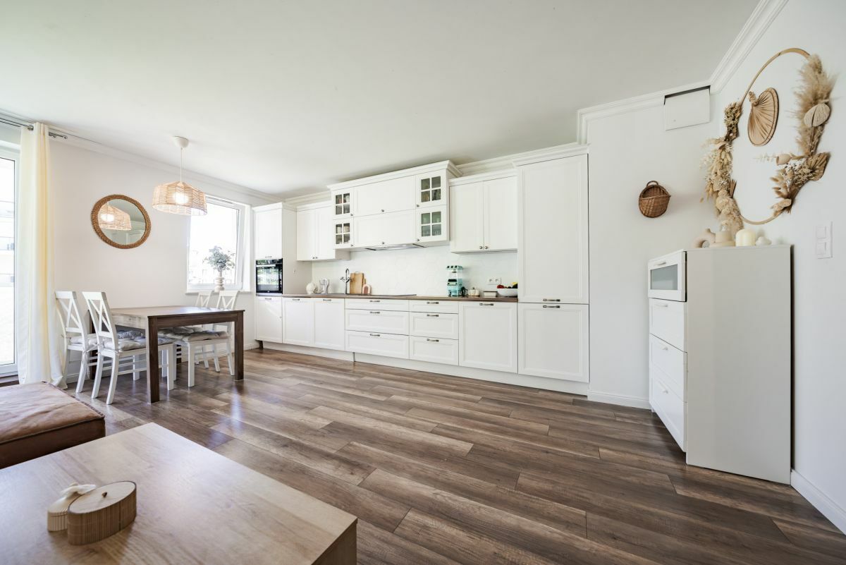 W mieszkaniu pozostaje duża zabudowa kuchenna wraz ze sprzętem AGD: lodówka w zabudowie, zmywarka, płyta indukcyjna, piekarnik, okap, pralka.