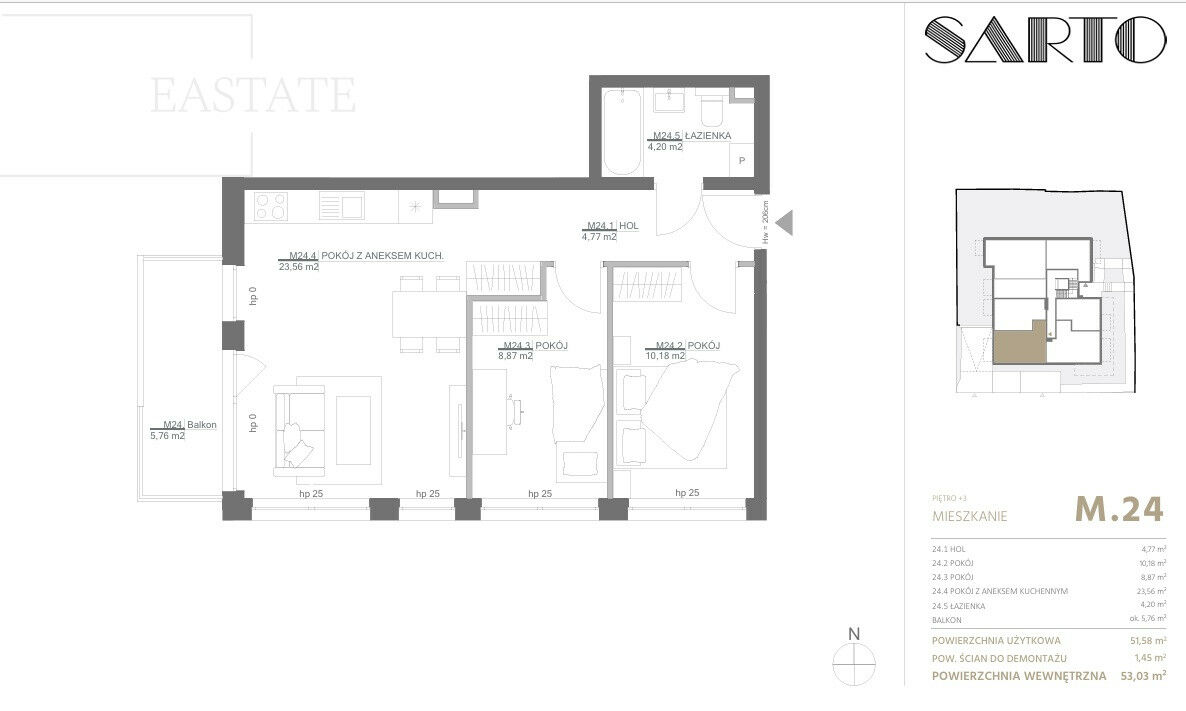 W skład wchodzą 3 pokoje o pow. 51,58m2 z balkonem 5,76m2.