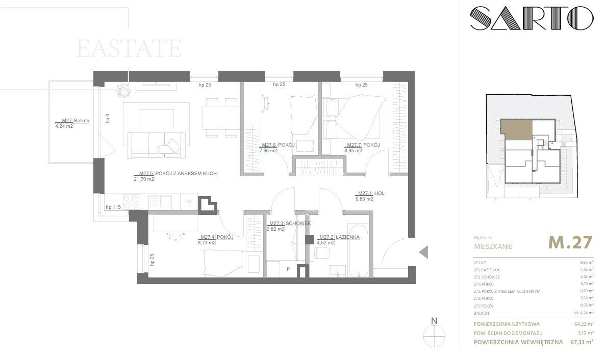 W skład wchodzą 4 pokoje o pow. 67,33m2 z balkonem 4,24m2.