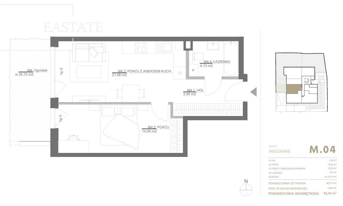 W skład wchodzą salon z aneksem kuchennym i sypialnią o pow. 43,58m2 z ogródkiem 29,72m2.