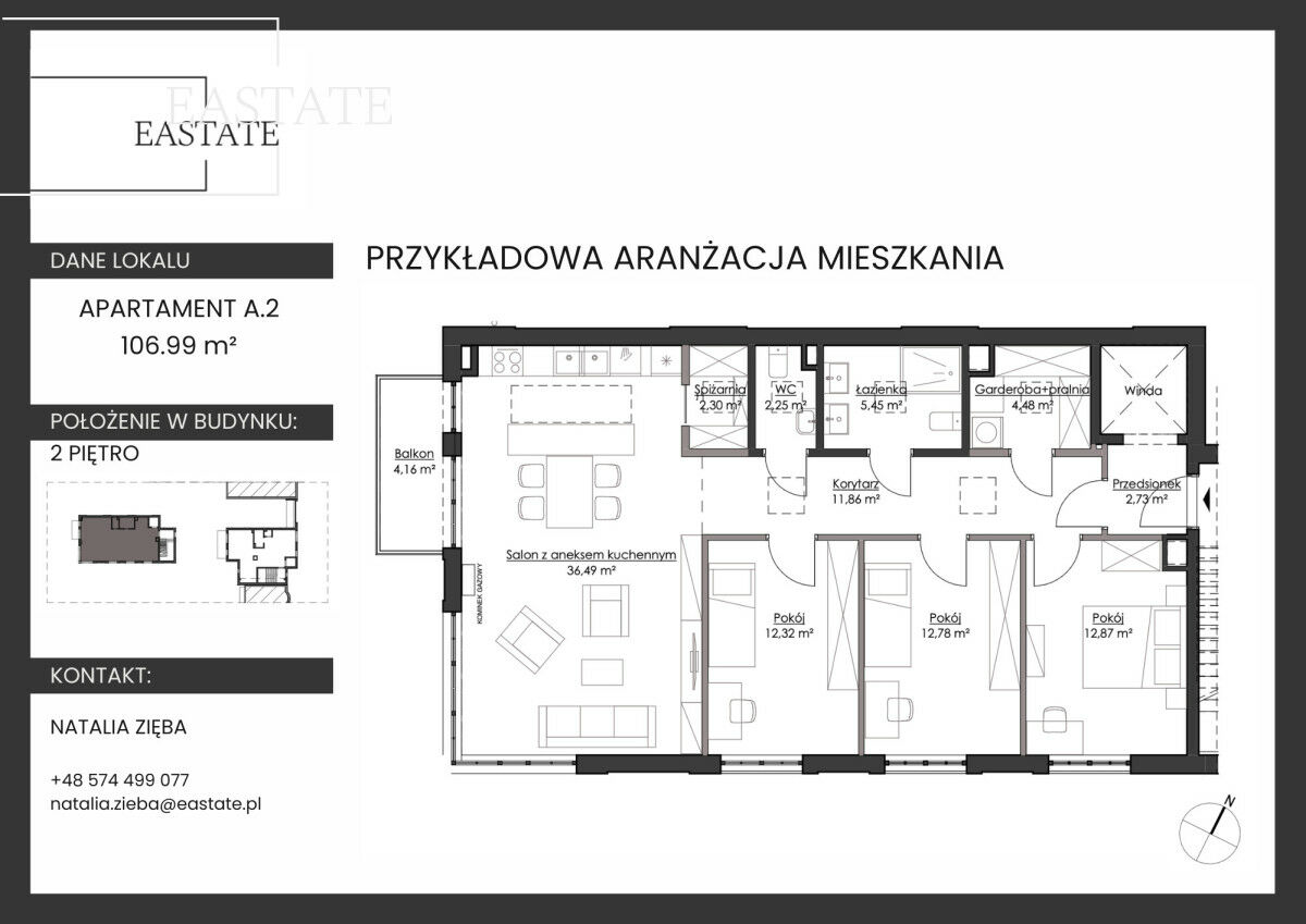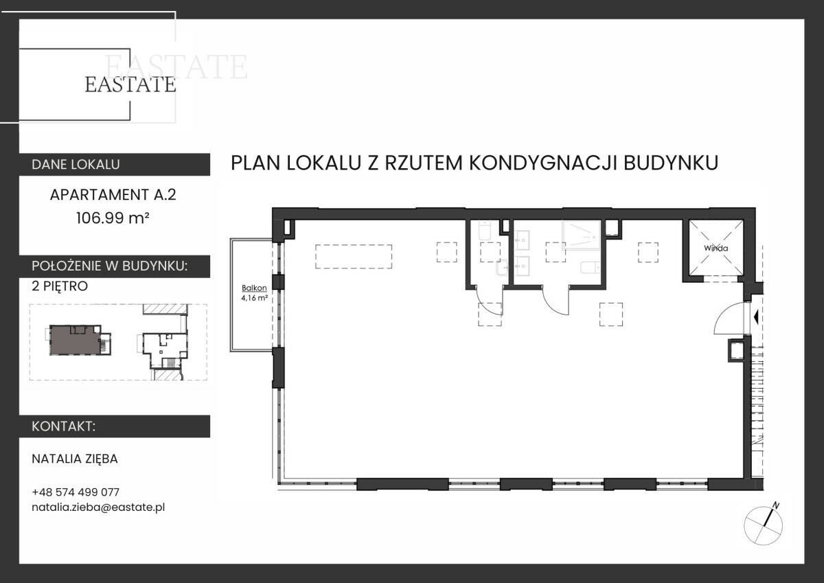 Przestronny apartament o powierzchni 107 m², z balkonem oraz dużym tarasem na dachu, zapewnia możliwość pełnej, indywidualnej aranżacji - w tym dostosowania układu do własnych potrzeb.