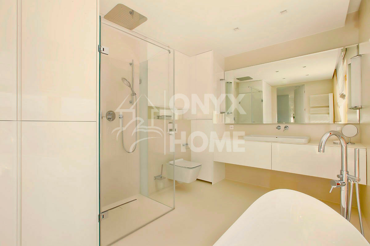 - Luksusową łazienkę z dużymi przeszkleniami, wanną i prysznicem walk-in,