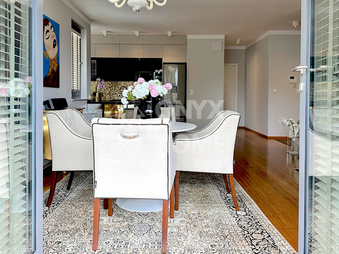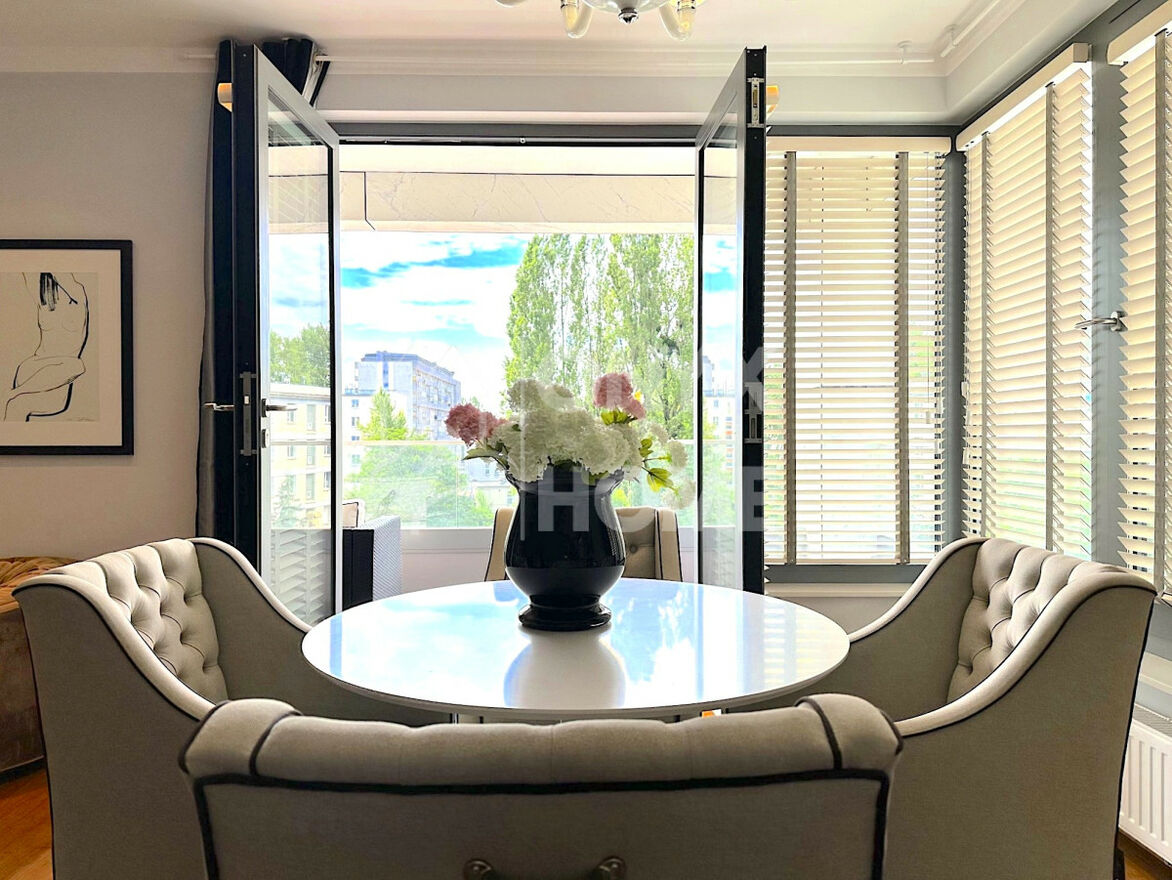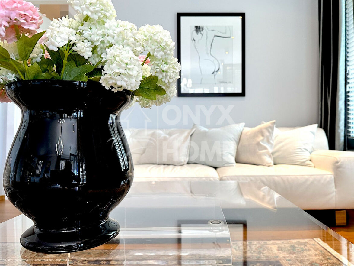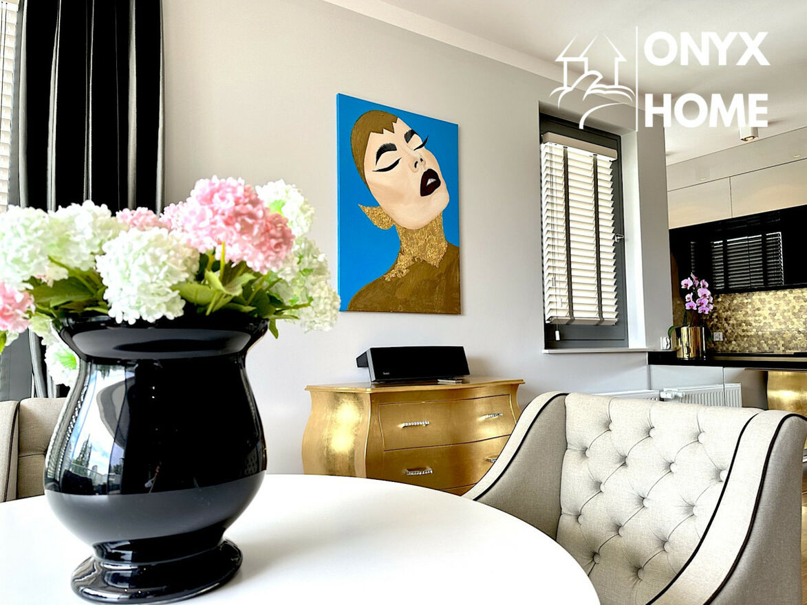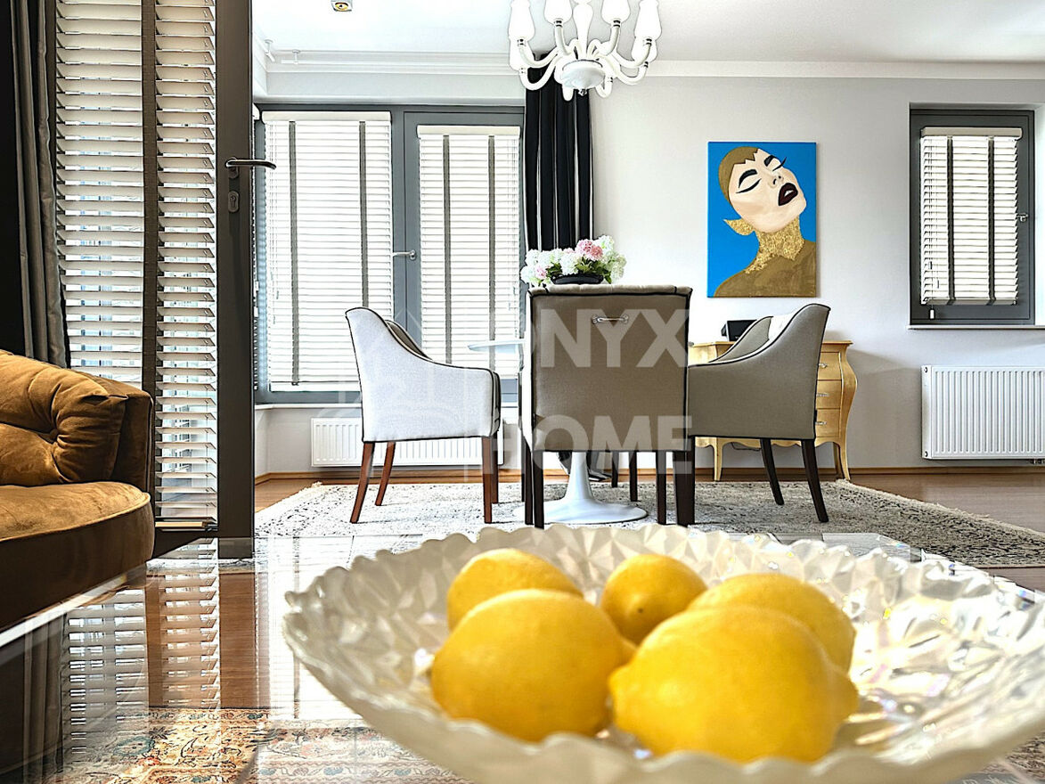 - Duży salon z przestronną loggią. Wyposażony w stół z wysokiej jakości krzesłami tapicerowanymi, kanapę, komodę, fotel oraz ławę. Całość uzupełniają dodatki premium: obrazy, wazony, misy, zasłony, dywany, oświetlenie, kwiaty.