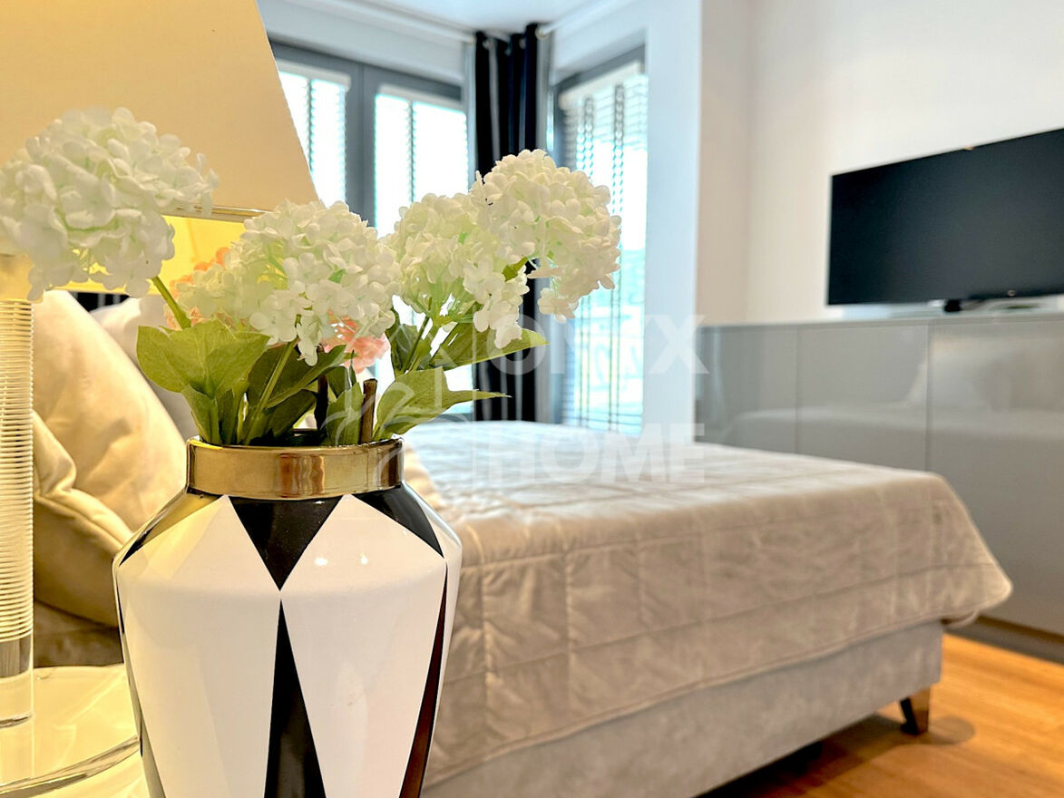 - Sypialnia wyposażona w duże łóżko, 2 komody, tv, stoliki nocne, zasłony i żaluzje drewniane. Z wyjściem na loggię oraz prywatną łazienkę.