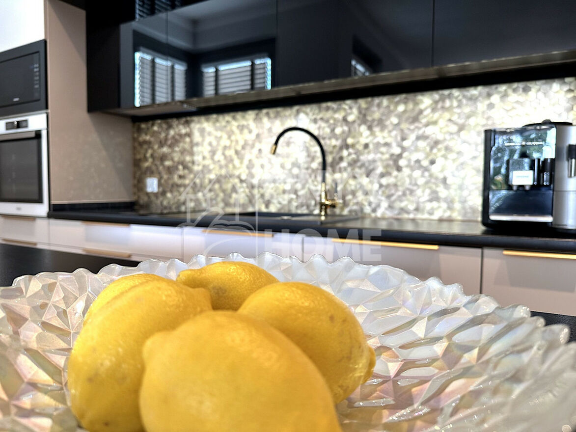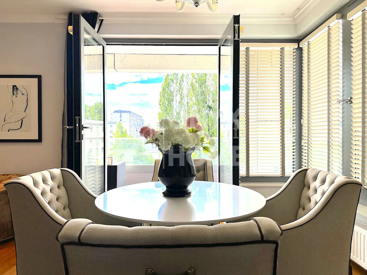 - Duży salon z przestronną loggią. Wyposażony w stół z wysokiej jakości krzesłami tapicerowanymi, kanapę, komodę, fotel oraz ławę.
