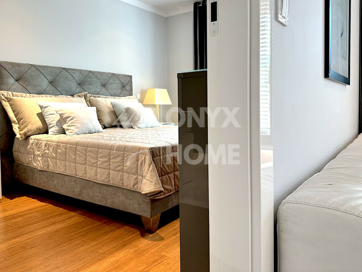 - Sypialnia wyposażona w duże łóżko, 2 komody, tv, stoliki nocne, zasłony i żaluzje drewniane. Z wyjściem na loggię oraz prywatną łazienkę.