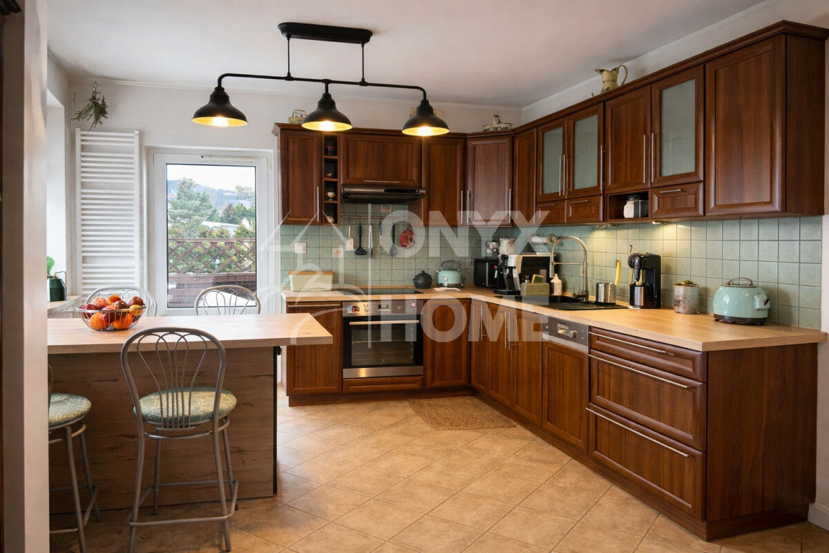 - kuchnia w pełni wyposażona z dużym oknem i możliwością wyjścia na taras,