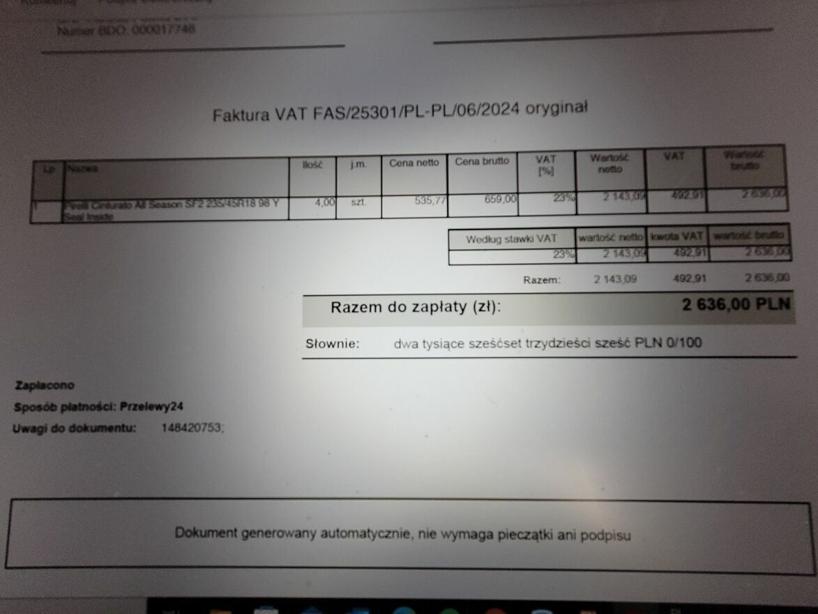 Opony całoroczne Pirelli Cinturato All Season SF2 235/45R18 98 Y Seal InsideOpony kupiłem w czerwcu 2024 roku za 2636 zł do Volvo V60 (faktura w załączeniu). Używane przez 6000 km, głównie w długich trasach. Bieżnik ok. 7 mm, bez jakichkolwiek śladów uszkodzeń. Sprzedaję, ponieważ sprzedałem samochód z kompletem opon sezonowych. Te czekają na nowego właściciela!