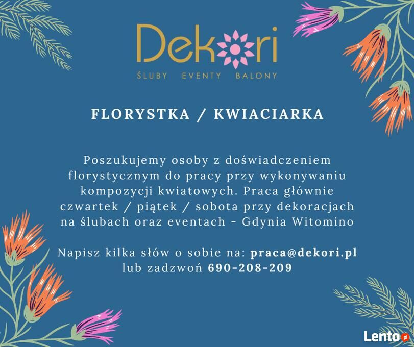 Poszukujemy osoby koniecznie z doświadczeniem florystycznym do pracy przy wykonywaniu kompozycji kwiatowych. Praca głównie czwartek / piątek / sobota przy dekoracjach na ślubach oraz eventach - Gdynia Witomino. Stawka od 25 zł na rękę.Napisz kilka słów o sobie na: @ lub zadzwoń 690 - pokaż numer telefonu -
