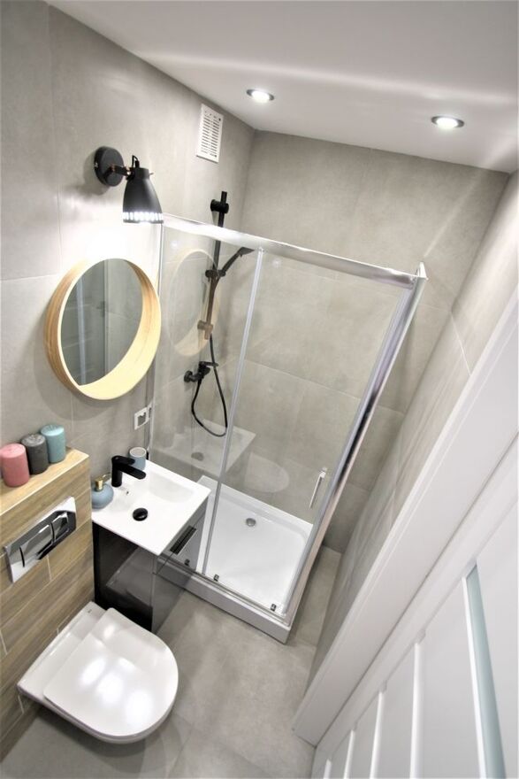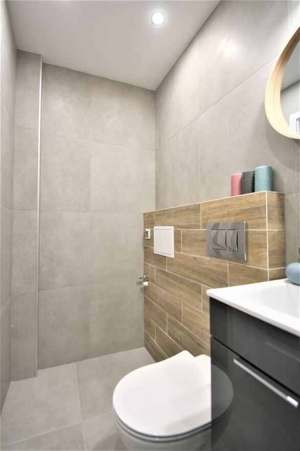 - łazienka z wc: na ścianach i podłodze nowe płytki, urządzenia sanitarne również nowe: umywalka z szafką podwieszaną z dwoma szufladami i baterią oraz prysznic z baterią prysznicową + wc,