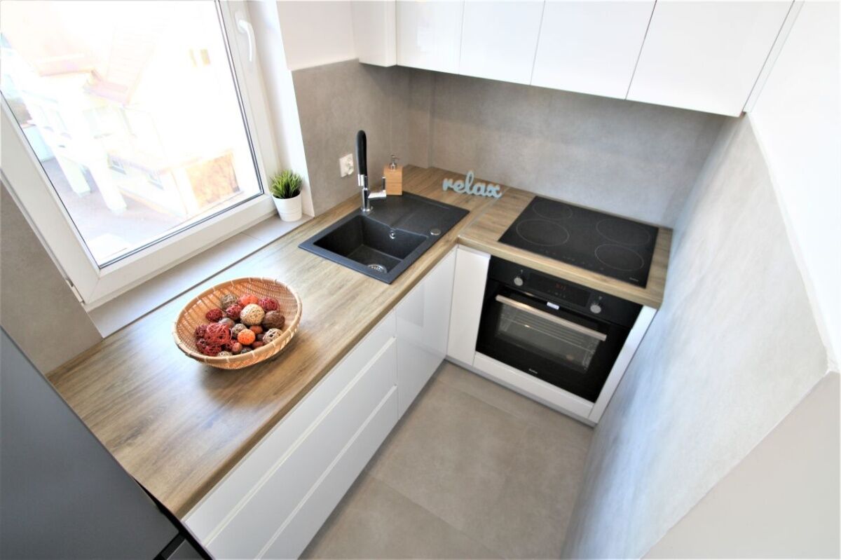 - kuchnia umeblowana wykonana na zamówienie (fronty na wysoki połysk, szafki z systemem cichego domyku, podświetlenie nadblatowe LED),
