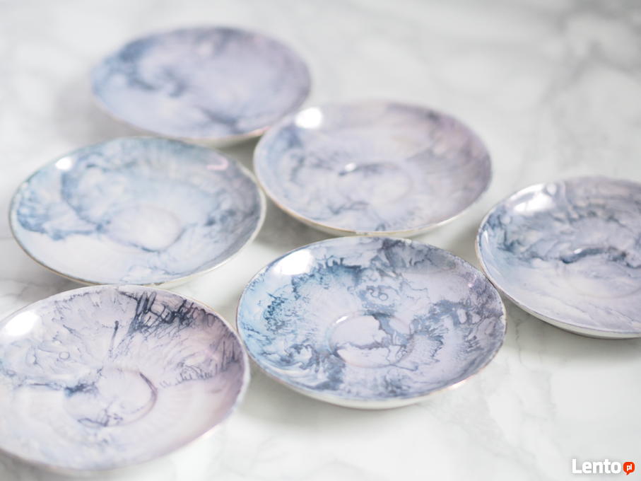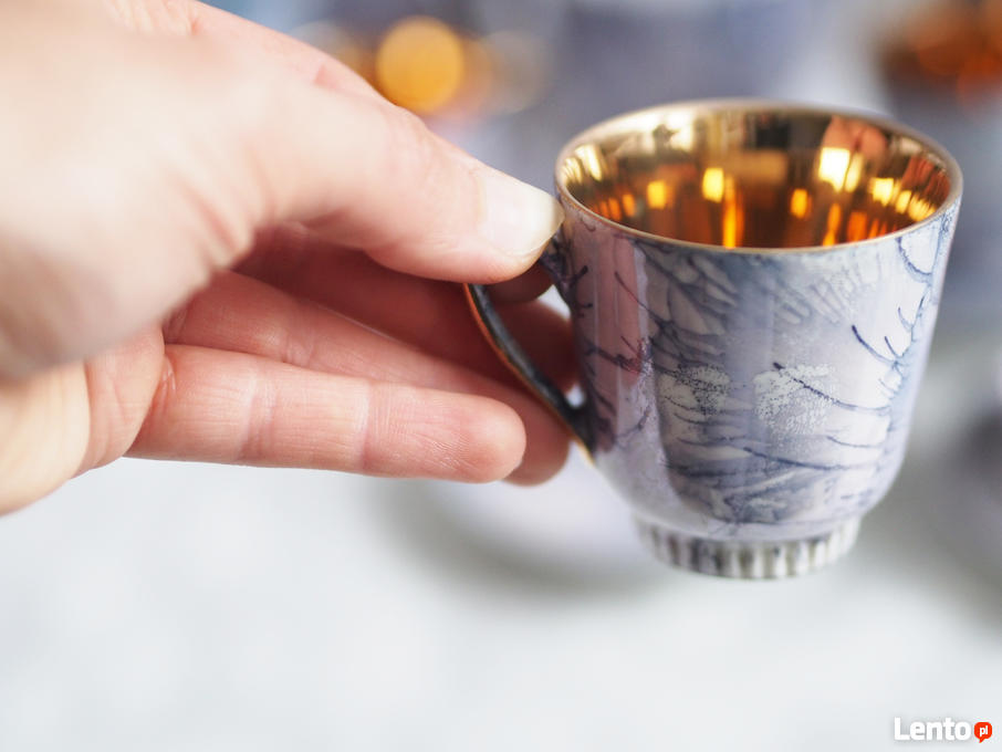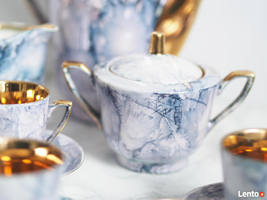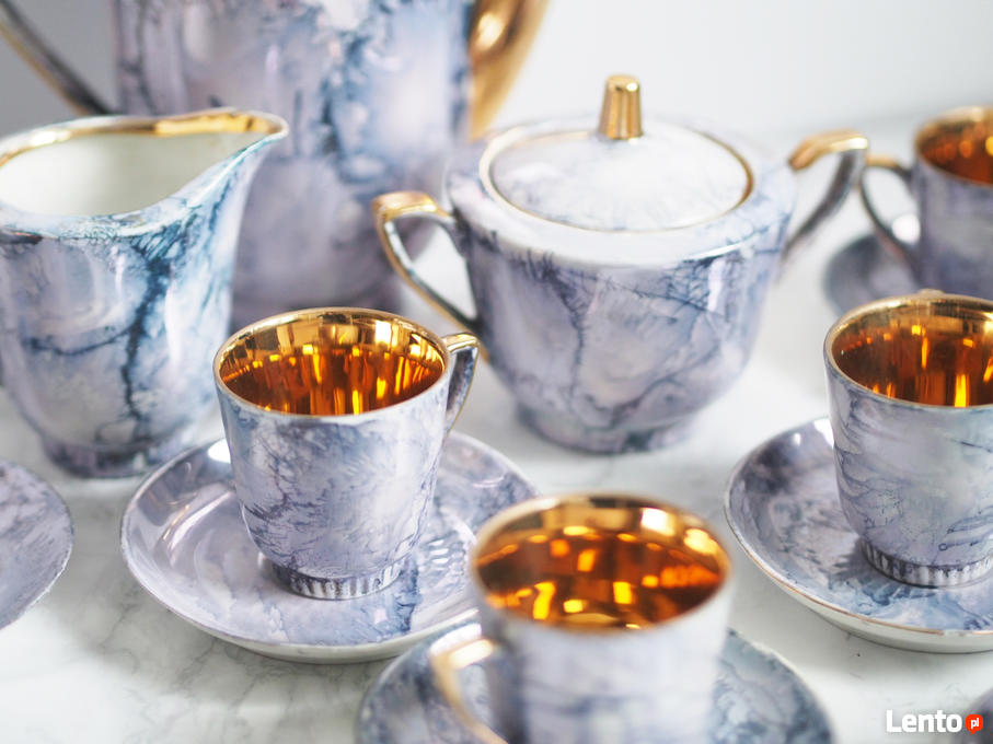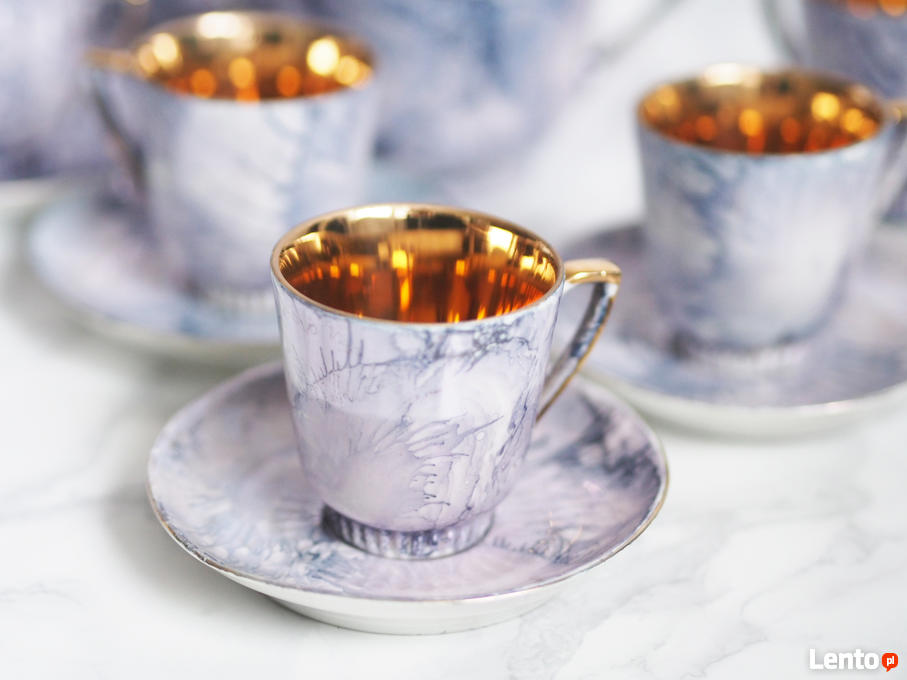 Ręcznie malowany, jedyny w swoim rodzaju, serwis kawowy dla 6 osób, wyprodukowany w latach 60. Pochodzący z Zakładu Porcelany Stołowej Karolina. Porcelana z przepięknym i efektownym ręcznie malowanym wzorem, dodatkowo zdobiona złoceniami. Serwis kompletny w stanie idealnym.Wymiary:
