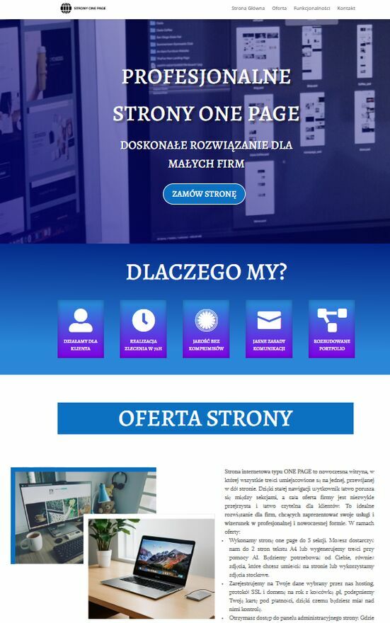Strona internetowa typu ONE PAGE to nowoczesna witryna, w której wszystkie treści umiejscowione są na jednej, przewijanej w dół stronie. Dzięki stałej nawigacji użytkownik łatwo porusza się między sekcjami, a cała oferta firmy jest niezwykle przejrzysta i łatwo czytelna dla klientów. To idealne rozwiązanie dla firm, chcących zaprezentować swoje usługi i wizerunek w profesjonalnej i nowoczesnej formie. W ramach oferty:W ramach oferty: