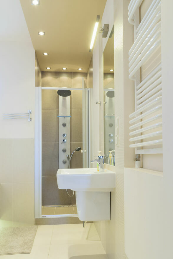 ŁAZIENKA z wanną w glazurze i terakocie.