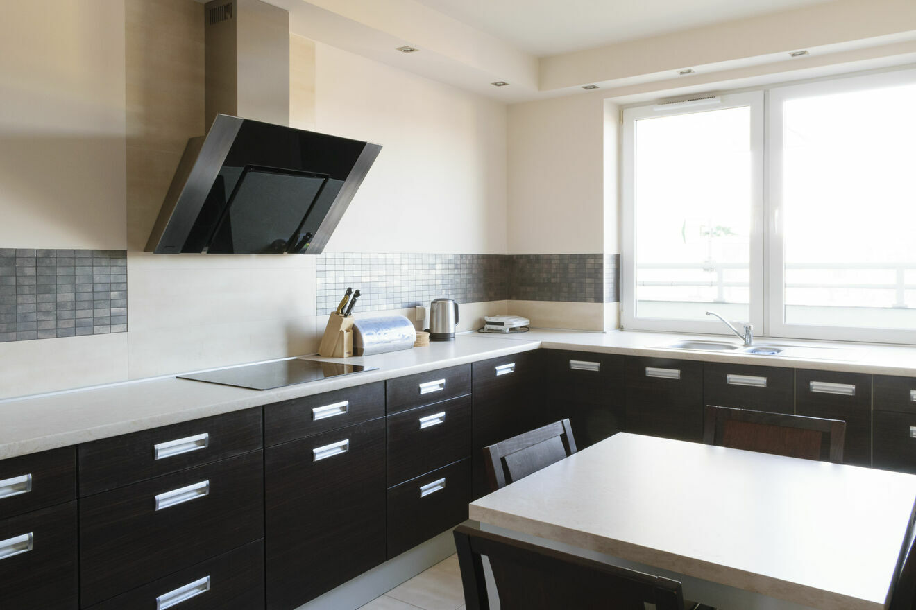 Kuchnia z oknem w nowoczesnej zabudowie, pełne AGD (lodówka, zmywarka, płyta, piekarnik),